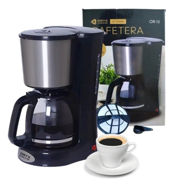 Cafetera Electrica Oryx OR-13 1,2Litros La cafetera eléctrica Oryx OR-13 es un modelo de filtro semi-automático diseñado para preparar café de manera sencilla y eficiente. Especificaciones Técnicas - Potencia: 900 W - Capacidad: 1.2 litros (equivalente a aproximadamente 12 tazas de café) - Material: Plástico de alta calidad y jarra de vidrio - Sistema de antigoteo: Sí, para evitar derrames durante el servicio - Filtro: Permanente, lo que elimina la necesidad de filtros desechables - Luz indicadora: Sí, para mostrar el estado de funcionamiento - Diseño: Moderno y elegante, fácil de limpiar Ideal para quienes buscan una cafetera sencilla y eficiente. El filtro permanente reduce los costos a largo plazo. Ocupa poco espacio en la cocina, ideal para espacios reducidos.
