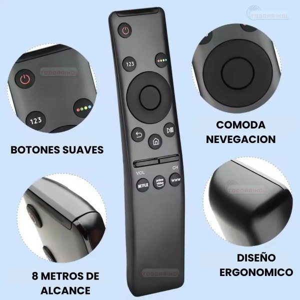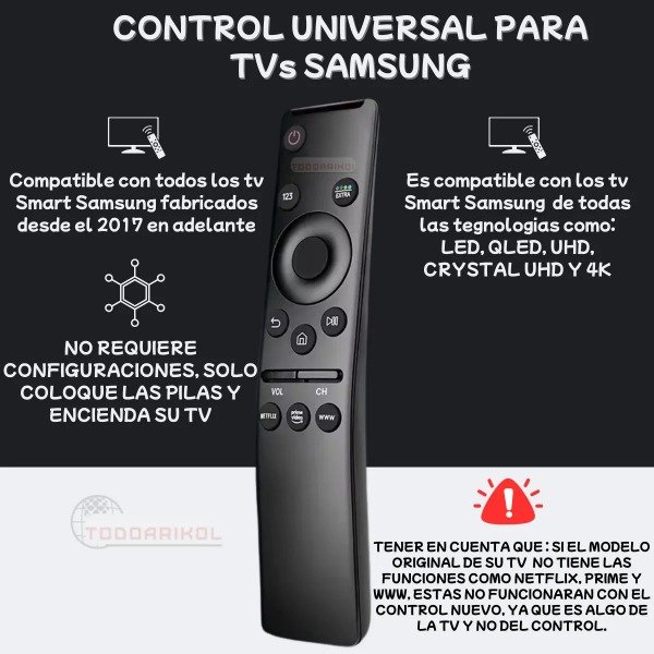 📺 Control Remoto Samsung Universal ✅ Características principales • Compatibilidad universal: Funciona con todos los modelos de televisores Samsung, incluyendo Full HD, UHD, 4K y Smart TV, sin importar las pulgadas. • Listo para usar: No requiere programación. Solo insertá 2 pilas AA (no incluidas) y comenzá a usarlo. • Material resistente: Fabricado en ABS de alto impacto, lo que garantiza durabilidad y resistencia a caídas y golpes. • Diseño funcional: Incluye teclas de acceso directo a plataformas como Netflix y Prime Video. • Uso versátil: Ideal para reemplazar un control perdido o dañado, o como control adicional en el hogar. 📦 Especificaciones técnicas • Modelo: BN59-01358D • Compatible con: Samsung AU7000 UHD 4K Smart TV y otros • Alimentación: 2 pilas AA (no incluidas) • Material: ABS de alto impacto • Funciones: Control completo + teclas de acceso rápido 📋 Modelos compatibles Este control remoto es compatible con una amplia gama de modelos Samsung. Algunos de ellos incluyen: • Serie AU7000 / AU7100 / AU7200 / AU7500 / AU7700 / AU8000 / AU8100 / AU8200 / AU9000 / AU9070 • Serie AUE60 / AUE70 • Serie Q60A / Q65A / Q70A / Q80A / QN85A / QS85A / QN90A • Modelos con sufijo K, GXPE, GXZS, KXZL, SXNZ, UXUA, GXUG, entre otros